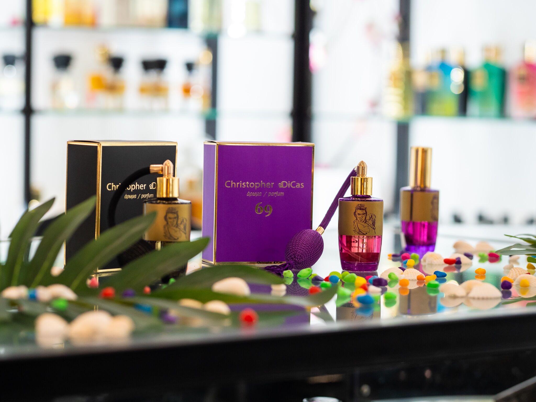 Első szavaival Budapestet és Magyarországot méltatta, kiemelve, hogy milyen szerencsések vagyunk a lakóhelyünket illetően. Persze ő is büszke lehet a szülőföldjére, és az első saját neve alatt kiadott parfümjét, a Christopher DiCas L'extrait-t a görög aromák és fűszerek köré „építette”. Ezek közül is kiemelte a masztixot (mastic), amely a Pistacia lentiscus fájának a gyantája. A második kompozícióját – amelynek nevét az elsőtől a Kámaszútrából ismert 69-es szám különbözteti meg – az Ezeregyéjszaka meséinek hangulata ihlette, egy érzéki, modern elixír.
