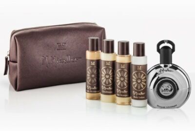 M. Micallef Les Exusif Royal Vintage utazószett, férfiaknak. Meleg kávészínű neszeszerben az ikonikus Royal Vintage eau de parfum 30 ml-es változatát tartalmazza, testápoló, sampon, hajbalzsam és tusfürdő kíséretében.