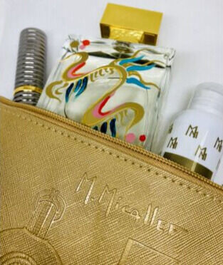 M. Micallef Summer Vibes szett egy aranyszínű neszeszer, ami tartamaz egy Pure Extreme edp-t, egy Ananda kézfertőtlenítőt és egy pocket spray-t.